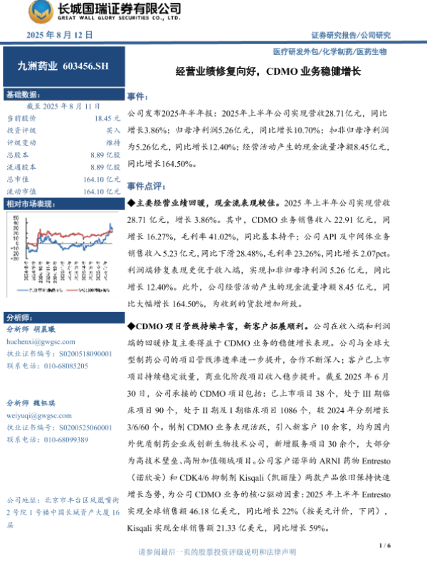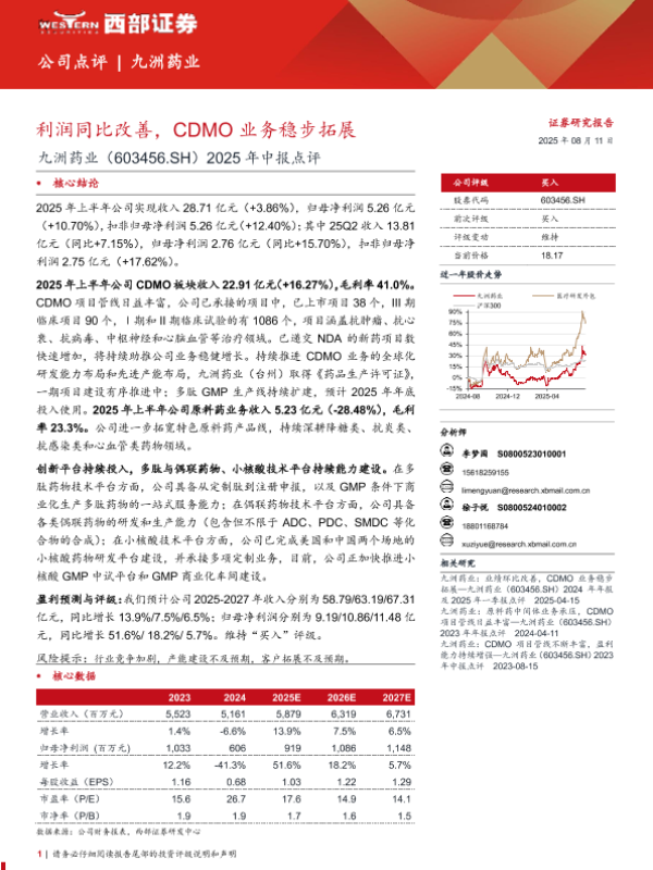 【西部证券】【20250811】九洲药业2025年中报点评:利润同比改善,CDMO业务稳步拓展-3页 证券期货研究报告