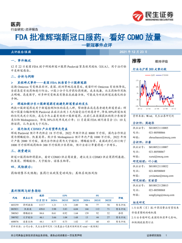【民生证券】【20211223】医药:新冠事件点评:FDA批准辉瑞新冠口服药,看好CDMO放量-3页 行业研究
