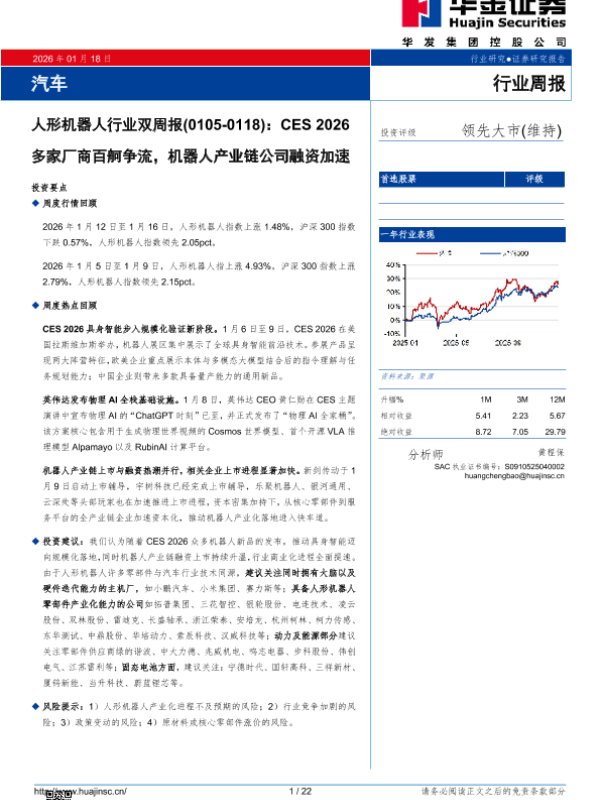 【华金证券】【2026】人形机器人行业双周报(0105-0118):CES 2026多家厂商百舸争流,机器人产业链公司融资加速-22页 证券期货研究报告