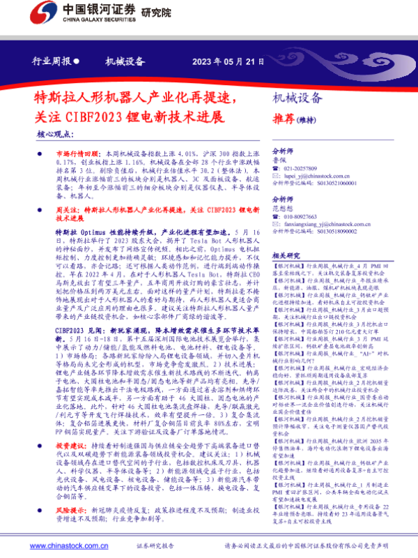 【银河证券】【20230521】机械设备行业周报:特斯拉人形机器人产业化再提速,关注CIBF2023锂电新技术进展-20页 行业研究