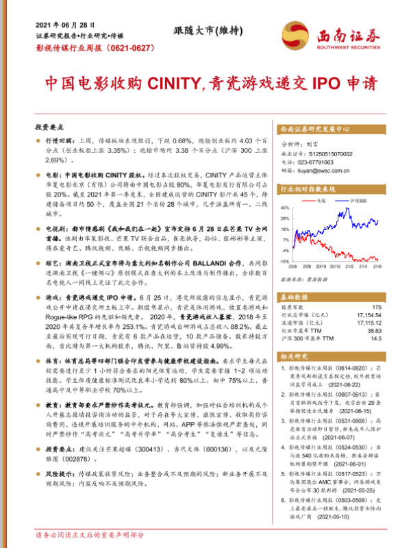 【西南证券】【20210628】20210628-西南证券-影视传媒行业周报:中国电影收购CINITY,青瓷游戏递交IPO申请-19页 行业研究