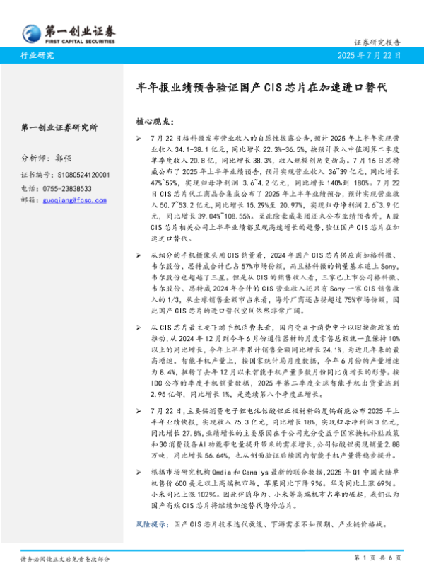 【第一创业证券】【20250722】半年报业绩预告验证国产CIS芯片在加速进口替代-6页 行业研究