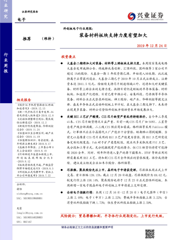 【兴业证券】【20191224】科创板电子行业周报:装备材料板块支持力度有望加大-14页 行业研究