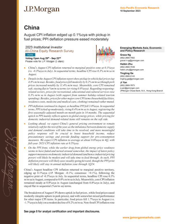 【J.P. Morgan】【20230910】FI-China August CPI inflation edged up 0.1%oya with pickup in fuel prices-14页 宏观策略