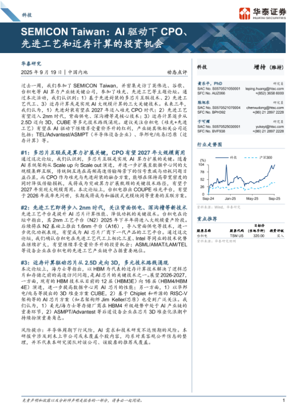 【华泰证券】【202509】科技行业动态点评:SEMICONTaiwan,AI驱动下CPO、先进工艺和近存计算的投资机会-19页 证券期货研究报告