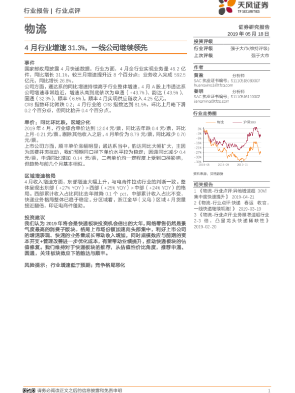 【天风证券】【20190518】4月行业增速31.3%,一线公司继续领先-7页 行业研究