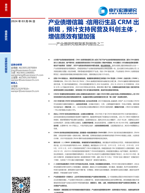 【申万宏源】【20240306】产业债研究框架系列报告之二-产业债增信篇:信用衍生品CRM出新规,预计支持民营及科创主体,增信质效有望加强-22页 行业研究