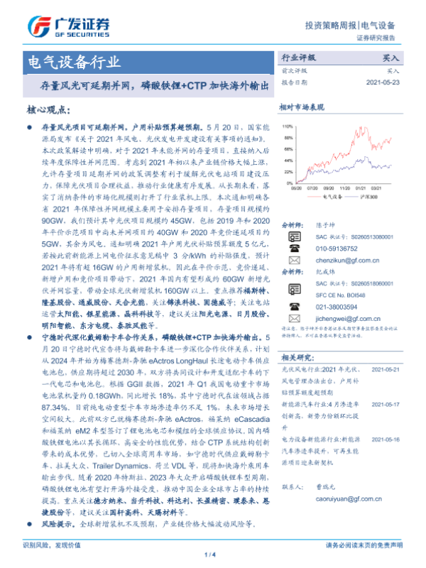 【广发证券】【20210523】电气设备行业投资策略周报:存量风光可延期并网,磷酸铁锂+CTP加快海外输出-4页 行业研究