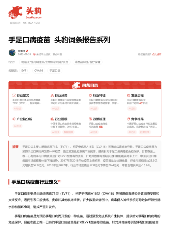 【头豹研究院】【20230731】手足口病疫苗 头豹词条报告系列-18页 行业研究