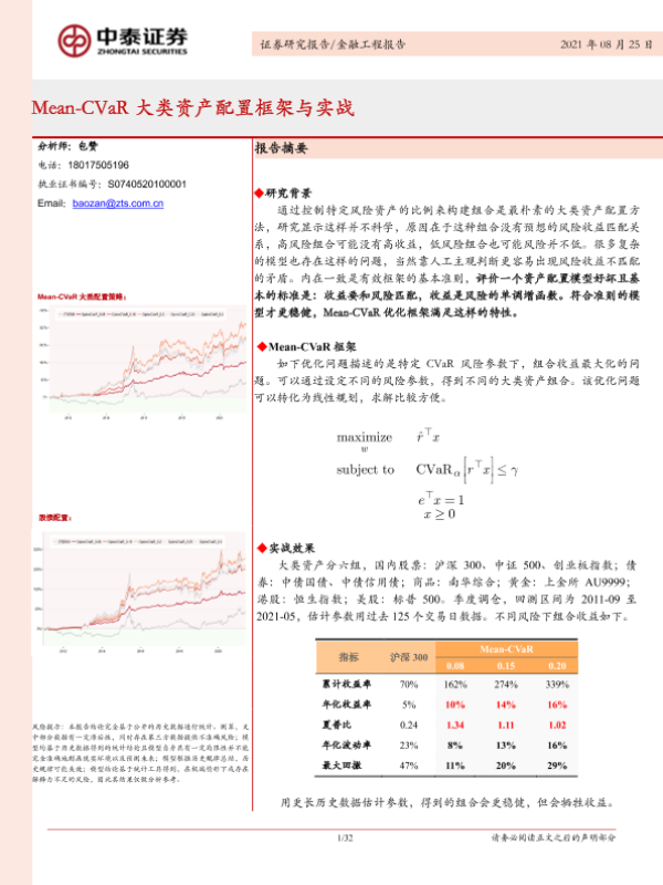【中泰证券】【20210825】金融工程报告:Mean-CVaR大类资产配置框架与实战-32页 行业研究