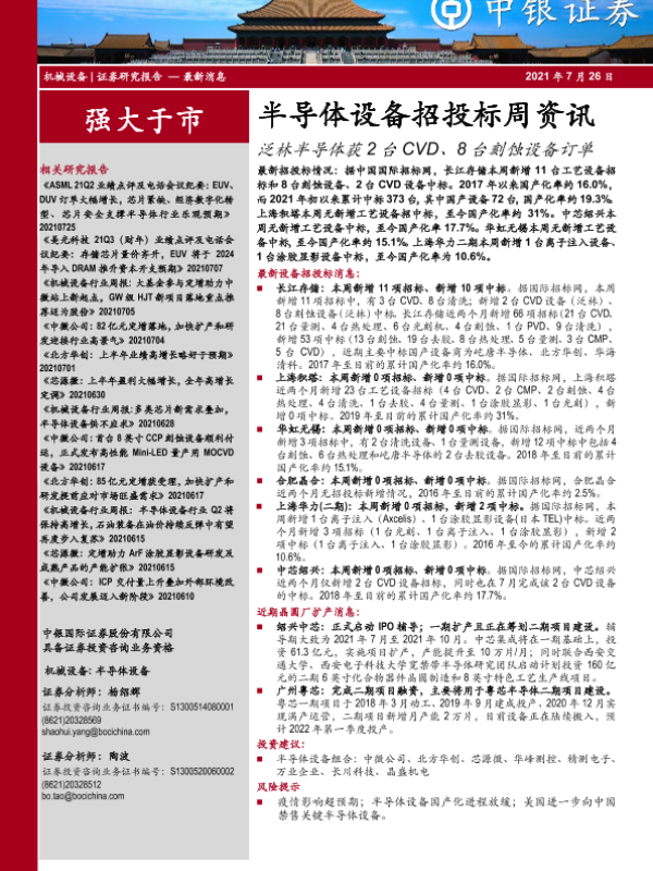 【中银证券】【20210726】20210726-中银证券-半导体设备招投标周资讯:泛林半导体获2台CVD、8台刻蚀设备订单-3页 行业研究
