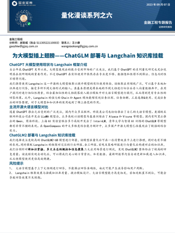 【国金证券】【20230907】量化漫谈系列之六:为大模型插上翅膀,ChatGLM部署与Langchain知识库挂载-16页 行业研究