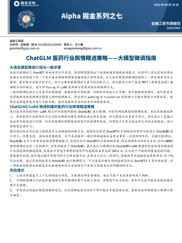 【国金证券】【20230910】Alpha掘金系列之七:大模型微调指南,ChatGLM医药行业舆情精选策略-23页 行业研究