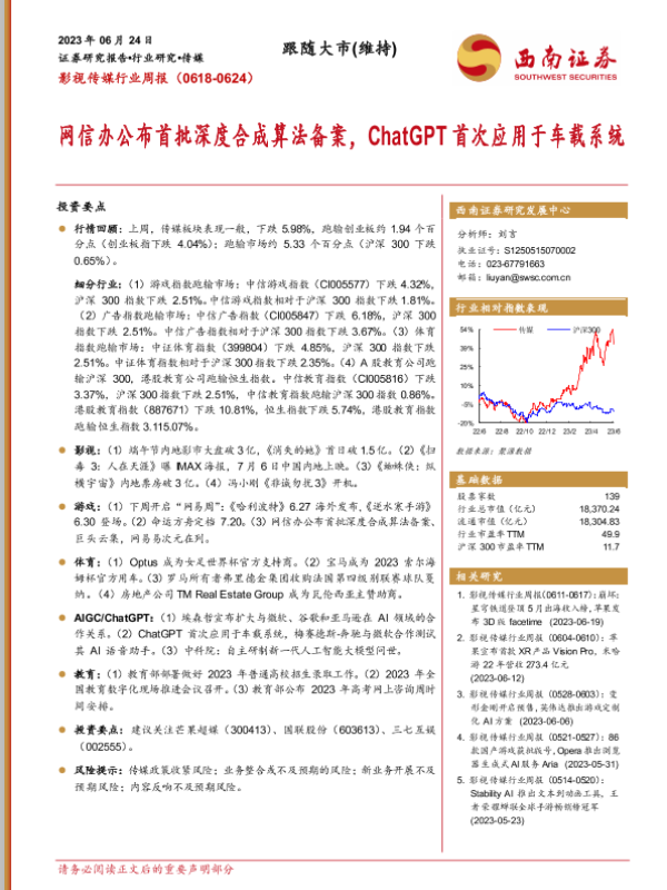 【西南证券】【20230624】影视传媒行业周报:网信办公布首批深度合成算法备案,ChatGPT首次应用于车载系统-20页 行业研究