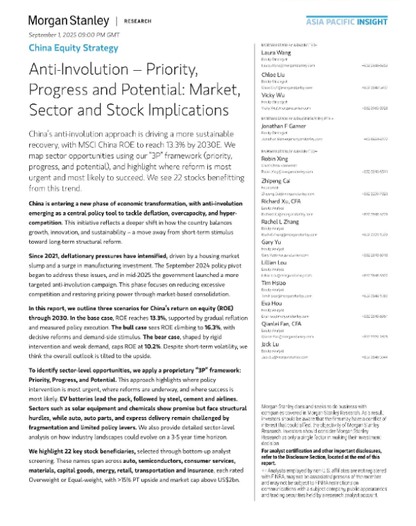 【Morgan Stanley】【202509】Anti-Involution - Priority, Progress and Potential Market, Sector and Stock Implications-75页 证券期货研究报告