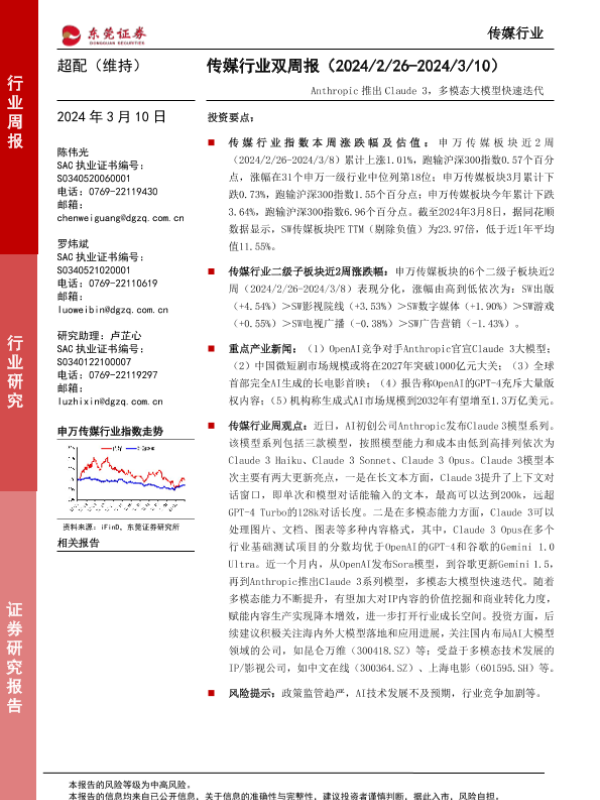 【东莞证券】【20240310】传媒行业双周报:Anthropic推出Claude 3,多模态大模型快速迭代-12页 行业研究