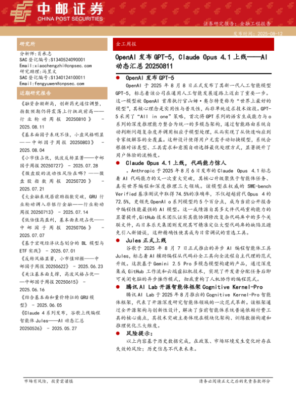 【中邮证券】【202508】AI动态汇总:OpenAI发布GPT-5,Claude+Opus+4.1上线-24页 证券期货研究报告