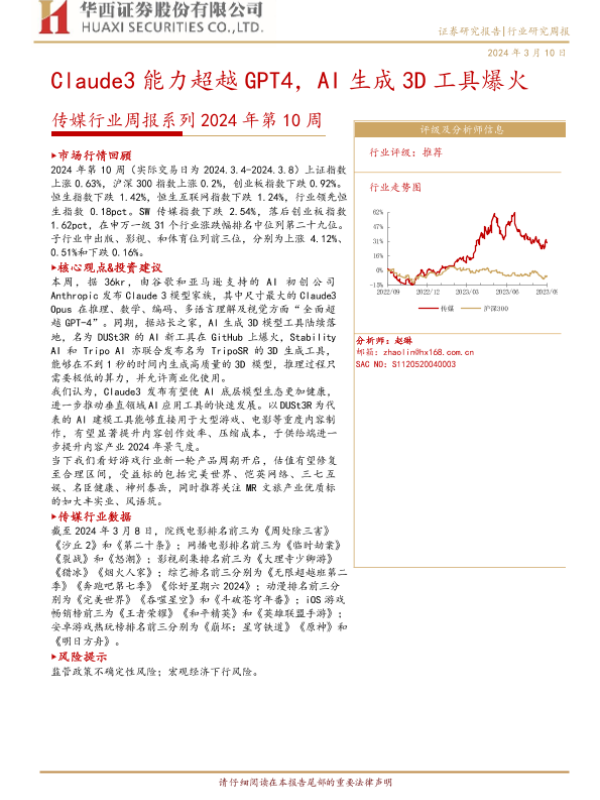 【华西证券】【20240310】2024年第10周:Claude3能力超越GPT4,AI生成3D工具爆火-34页 行业研究
