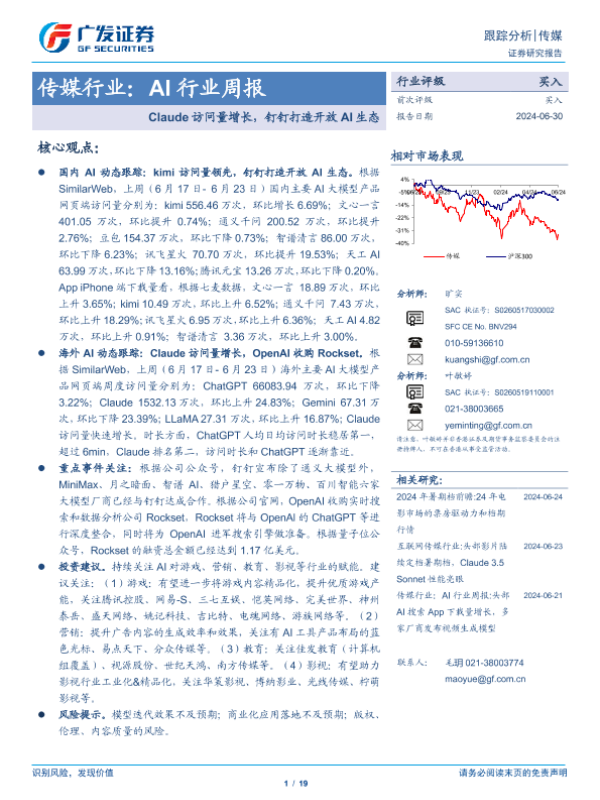 【广发证券】【20240630】AI行业周报:Claude访问量增长,钉钉打造开放AI生态-19页 行业研究