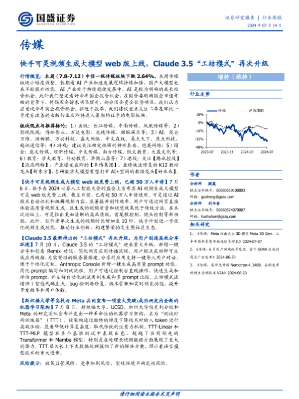 【国盛证券】【20240714】20240714-国盛证券-传媒行业周报:快手可灵视频生成大模型web版上线,Claude3.5“工坊模式”再次升级-10页 行业研究