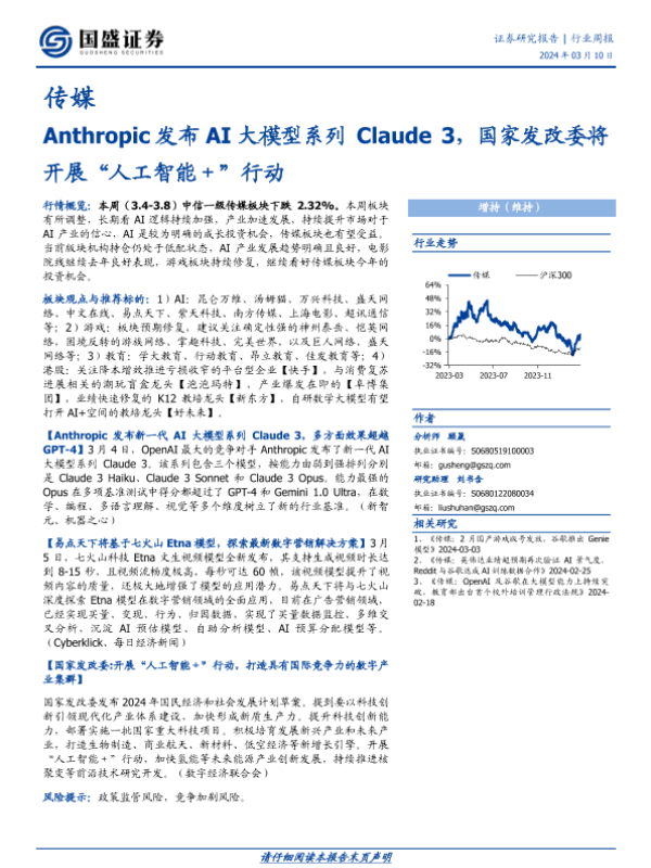 【国盛证券】【20240310】20240310-国盛证券-传媒行业周报:Anthropic发布AI大模型系列 Claude 3,国家发改委将开展“人工智能+”行动-10页 行业研究