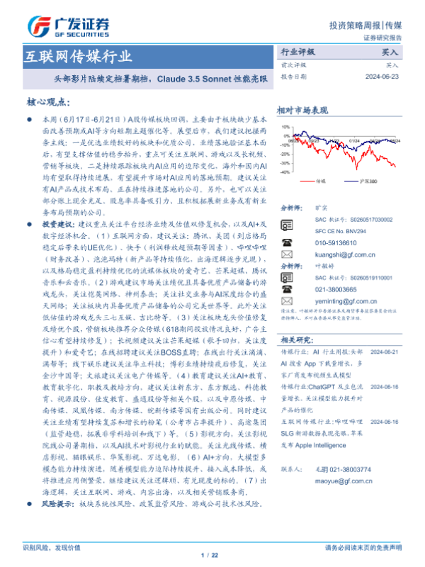 【广发证券】【20240623】互联网传媒行业投资策略周报:头部影片陆续定档暑期档,Claude 3.5 Sonnet性能亮眼-22页 行业研究