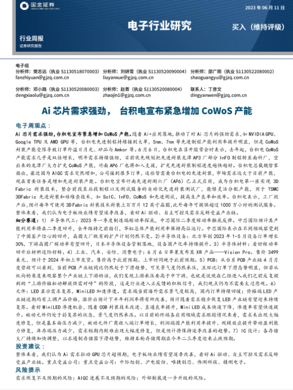 【国金证券】【20230611】电子行业研究:Ai芯片需求强劲,台积电宣布紧急增加CoWoS产能-14页 行业研究