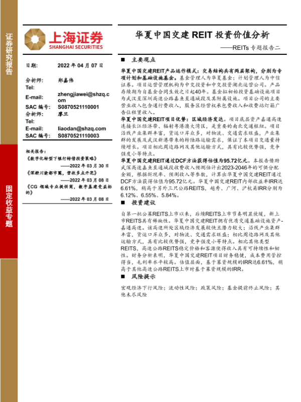 【上海证券】【20220407】REITs专题报告二:华夏中国交建REIT投资价值分析-22页 行业研究