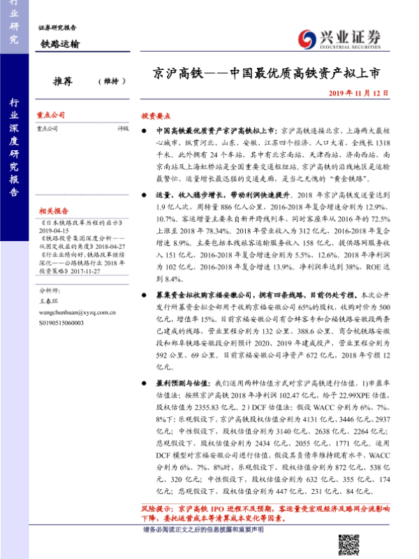 【兴业证券】【20191112】京沪高铁——中国最优质高铁资产拟上市-24页 行业研究