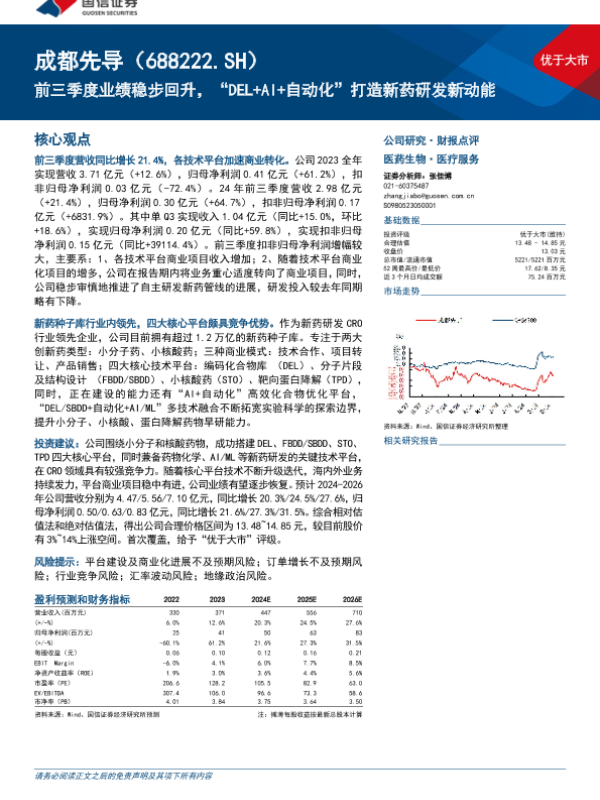 【国信证券】【20241105】成都先导(688222)前三季度业绩稳步回升,“DEL+AI+自动化”打造新药研发新动能-26页 行业研究