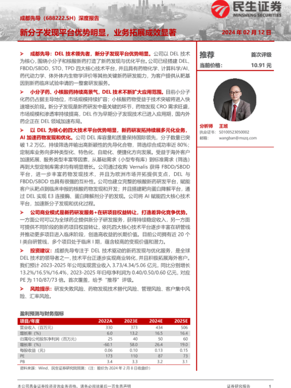 【民生证券】【20240212】20240212-民生证券-成都先导-688222.SH-深度报告:新分子发现平台优势明显,业务拓展成效显著-39页 行业研究