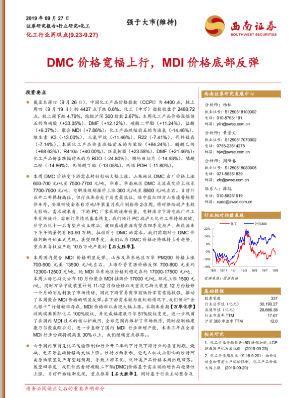 【西南证券】【20190927】20190927-西南证券-化工行业周观点:DMC价格宽幅上行,MDI价格底部反弹-9页 行业研究