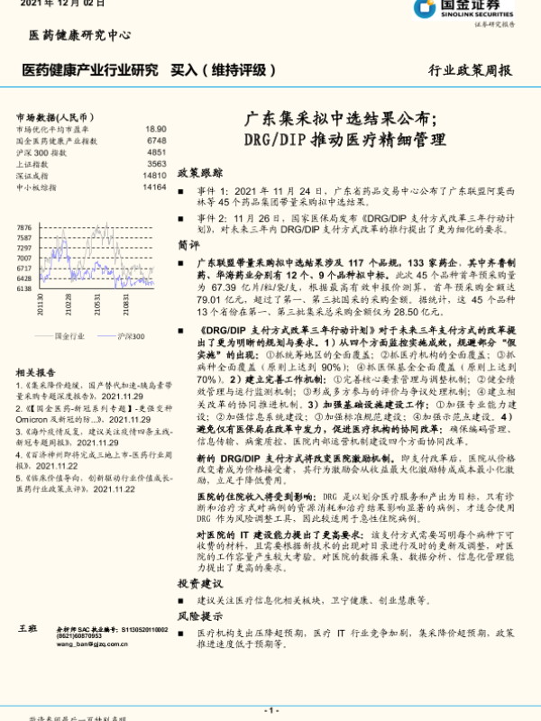 【国金证券】【20211202】医药健康产业行业研究:广东集采拟中选结果公布;DRG DIP推动医疗精细管理-7页 行业研究