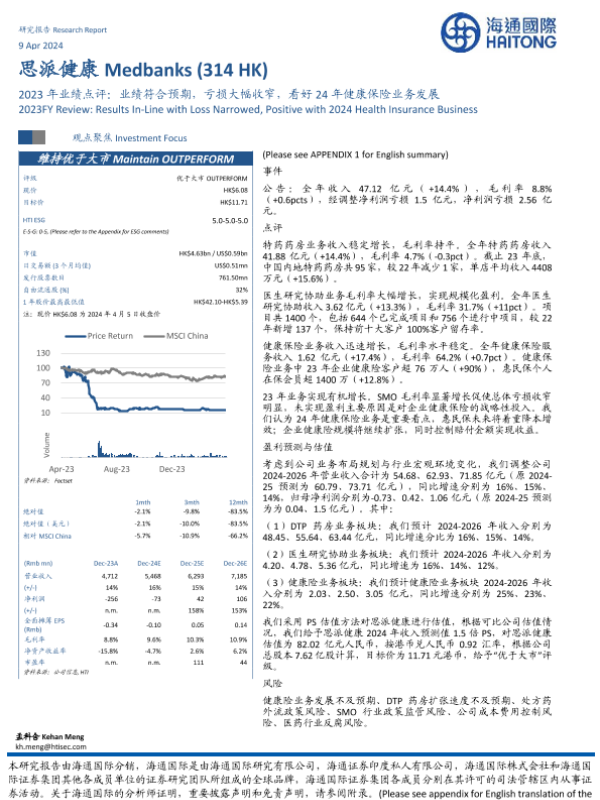 【海通国际】【20240409】思派健康(0314.HK)2023年业绩点评:业绩符合预期,亏损大幅收窄,看好24年健康保险业务发展-13页 行业研究