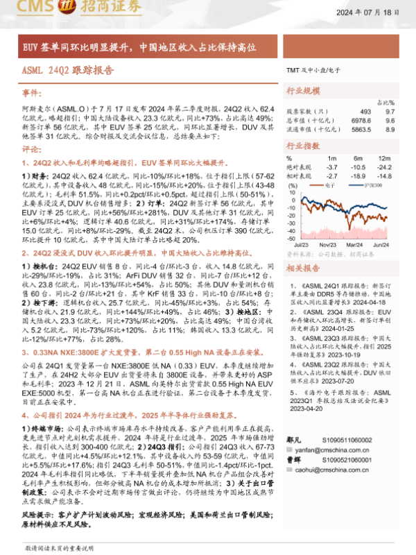 【海通证券】【20240718】电子行业ASML 24Q2跟踪报告:EUV签单同环比明显提升,中国地区收入占比保持高位-10页 行业研究