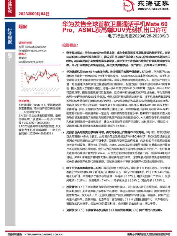 【东海证券】【20230904】电子行业周报:华为发售全球首款卫星通话手机Mate 60Pro,ASML获高端DUV光刻机出口许可-26页 行业研究