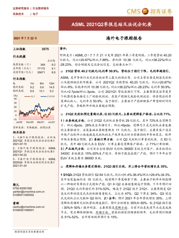 【海通证券】【20210723】海外电子行业跟踪报告:ASML_2021Q2季报总结及法说会纪要-13页 行业研究