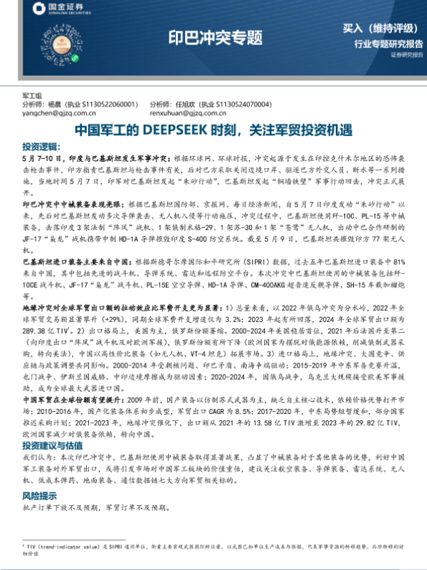【国金证券】【20250515】军工行业印巴冲突专题:中国军工的DEEPSEEK时刻,关注军贸投资机遇-15页 证券期货研究报告