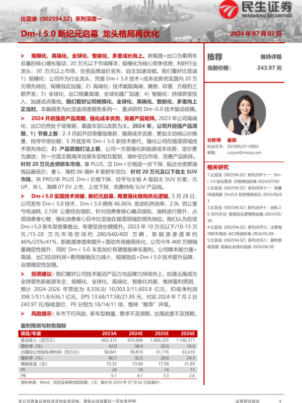 【民生证券】【20240702】比亚迪(002594.SZ)系列深度一:Dm-i5.0新纪元启幕 龙头格局再优化-37页 行业研究