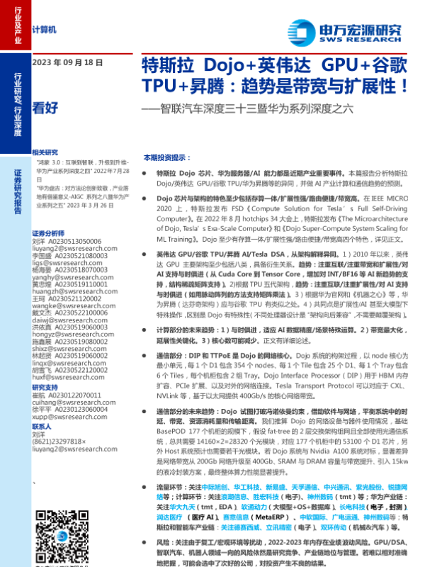 【申万宏源】【20230918】计算机行业智联汽车深度三十三暨华为系列深度之六:特斯拉Dojo+英伟达GPU+谷歌TPU+昇腾,趋势是带宽与扩展性!-29页 行业研究