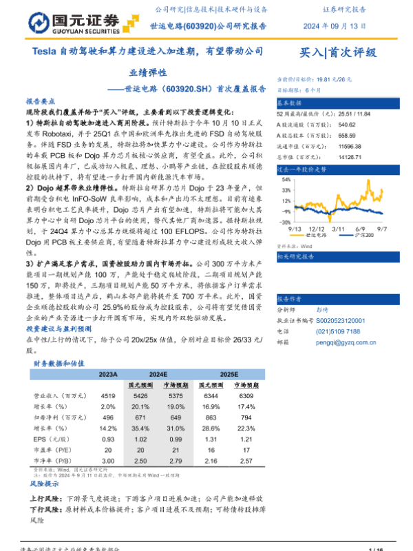 【国元证券】【20240913】世运电路(603920)首次覆盖报告:Tesla自动驾驶和算力建设进入加速期,有望带动公司业绩弹性-16页 行业研究