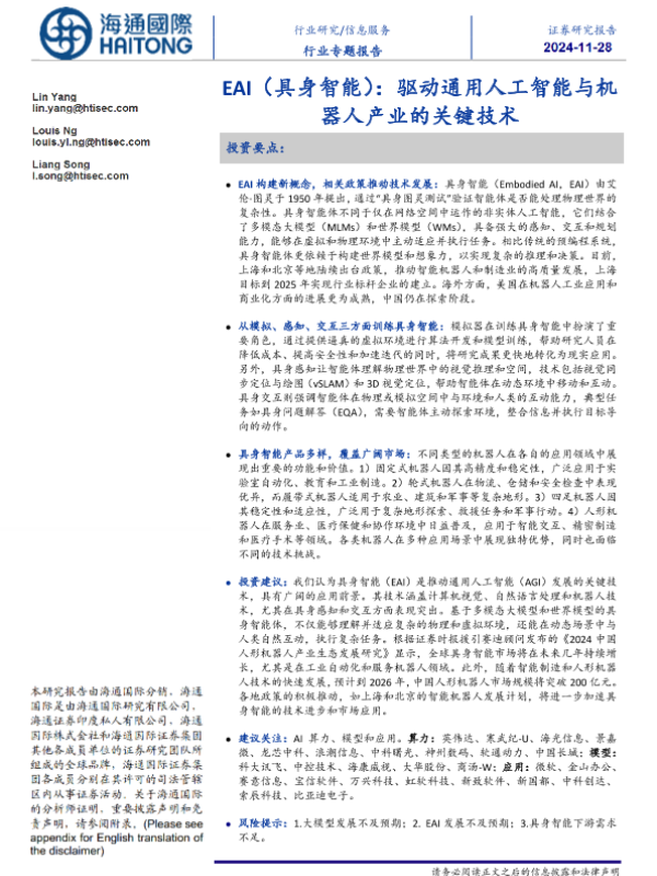 【海通国际】【20241128】EAI(具身智能):驱动通用人工智能与机器人产业的关键技术-37页 行业研究