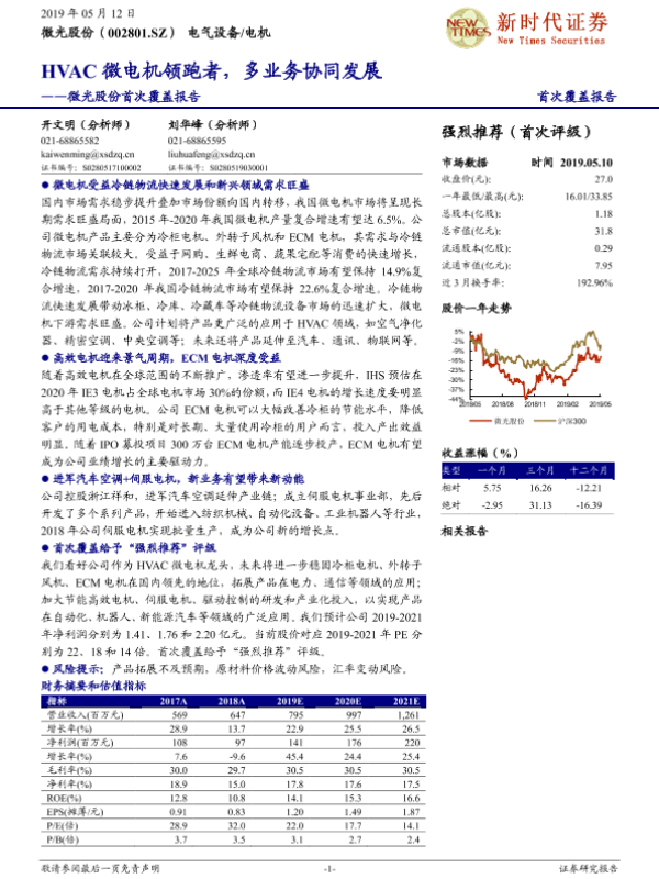 【新时代证券】【20190512】微光股份-002801.SZ-首次覆盖报告:HVAC微电机领跑者,多业务协同发展-25页 行业研究