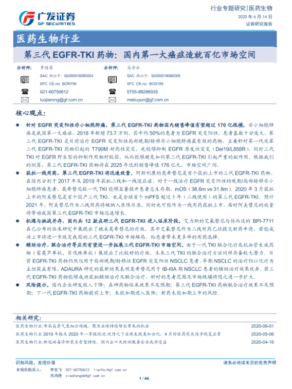 【广发证券】【20200614】第三代EGFR-TKI药物:国内第一大癌症造就百亿市场空间-44页 行业研究