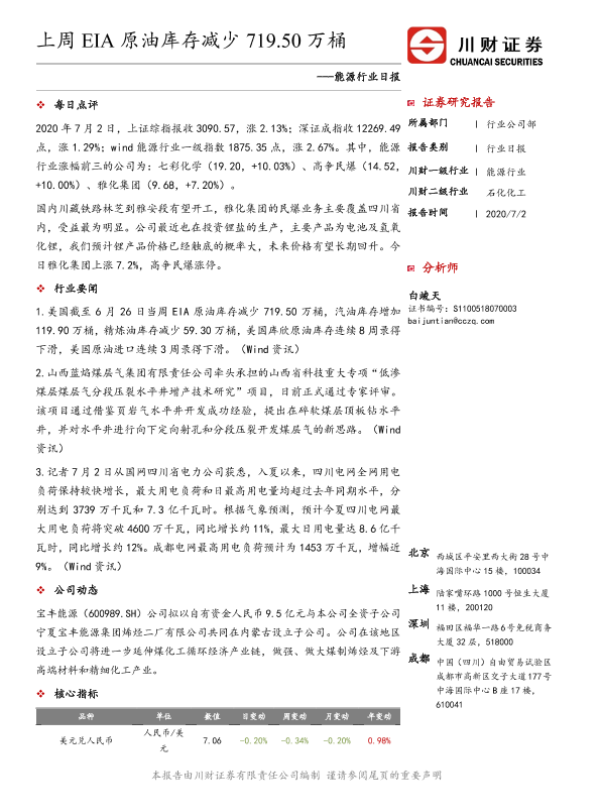 【川财证券】【20200702】能源行业日报:上周EIA原油库存减少719.50万桶-3页 证券期货研究报告