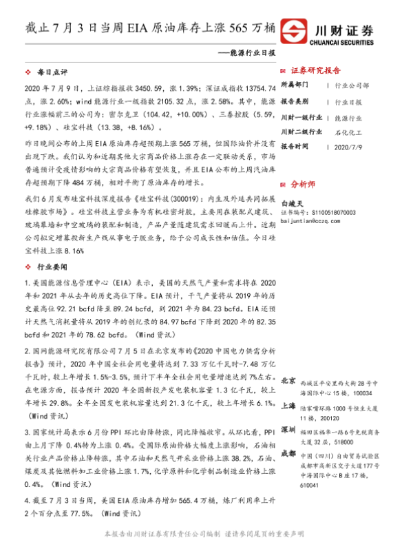 【川财证券】【20200709】20200709-川财证券-能源行业日报:截止7月3日当周EIA原油库存上涨565万桶-4页 行业研究