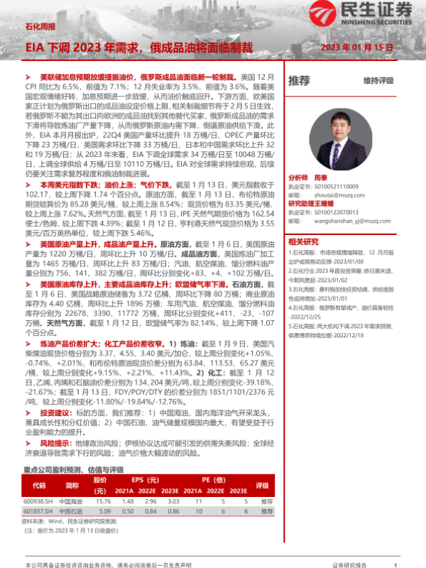 【民生证券】【20230115】20230115-民生证券-石化周报:EIA下调2023年需求,俄成品油将面临制裁-30页 行业研究
