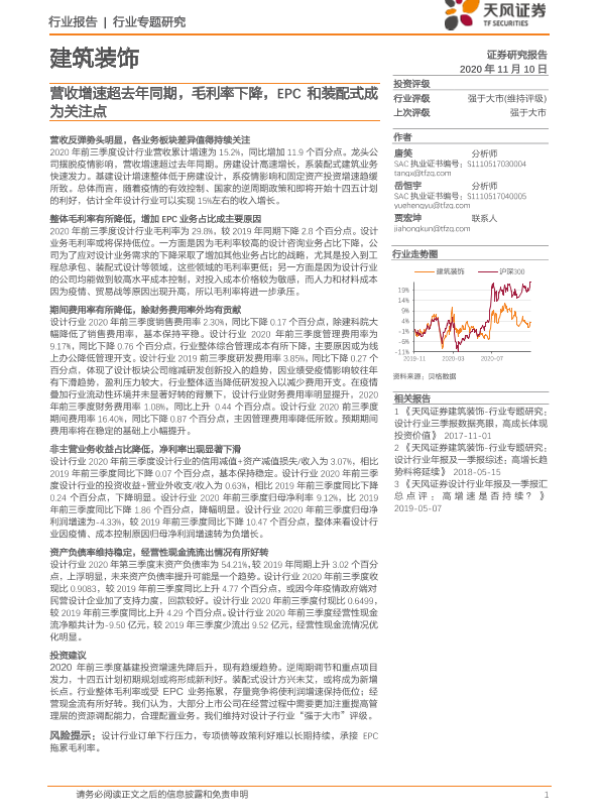 【天风证券】【20201110】建筑装饰行业专题研究:营收增速超去年同期,毛利率下降,EPC和装配式成为关注点-15页 行业研究