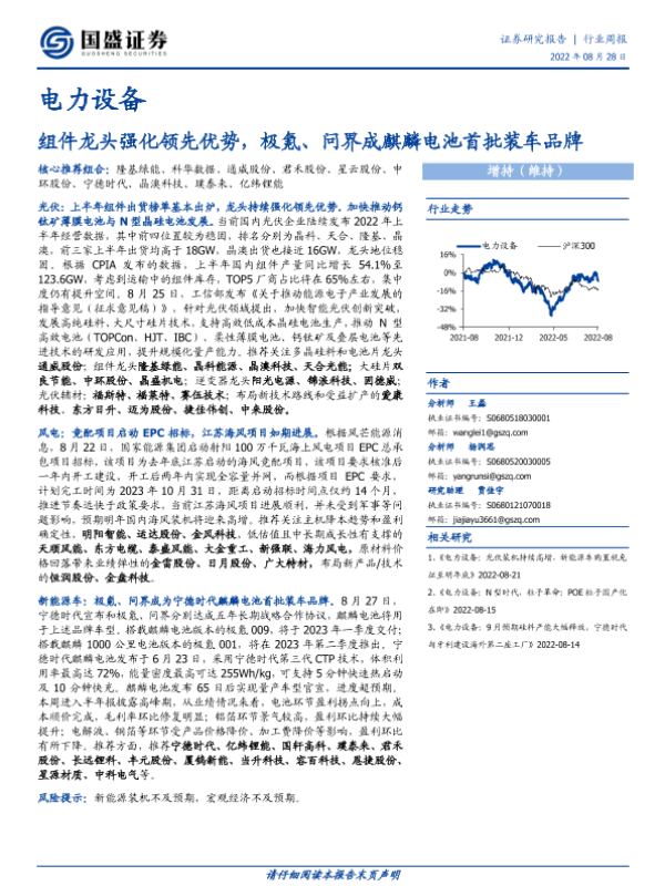 【国盛证券】【20220828】电力设备行业周报:组件龙头强化领先优势,极氪、问界成麒麟电池首批装车品牌-15页 行业研究