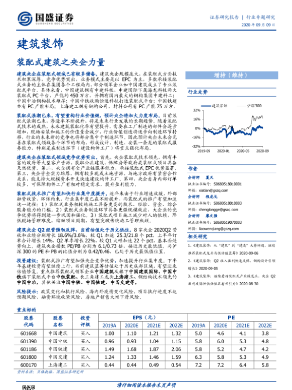 【国盛证券】【20200909】建筑装饰行业专题研究:装配式建筑之央企力量-19页 行业研究